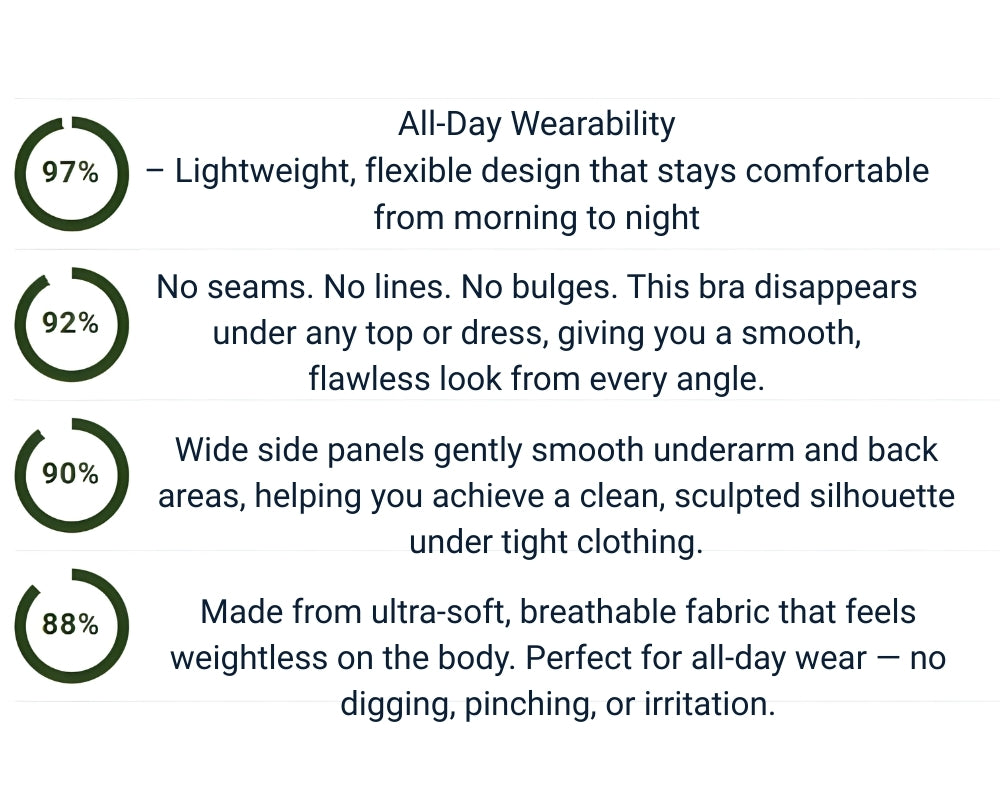 Made from ultra-soft, breathable fabric that feels weightless on the body. Perfect for all-day wear — no digging, pinching, or irritation.Wide side panels gently smooth underarm and back areas, helping you achieve a clean, sculpted silhouette under tight clothing.No seams. No lines. No bulges. This bra disappears under any top or dress, giving you a smooth, flawless look from every angle.